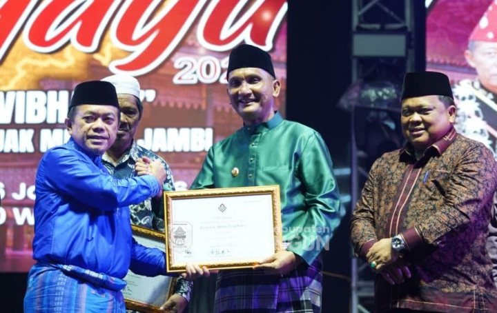 SAROLANGUN EKSPRES – Bupati Sarolangun H. Hurmin menghadiri sekaligus menerima Anugerah Warisan Budaya Nasional pada rangkaian Malam Keagungan Melayu 2026 dengan Tema “Kalavibhaga: Sang Kala Jejak Melayu Jambi” yang digelar di Arena Eks MTQ Jambi, Selasa malam (6/1/2026).